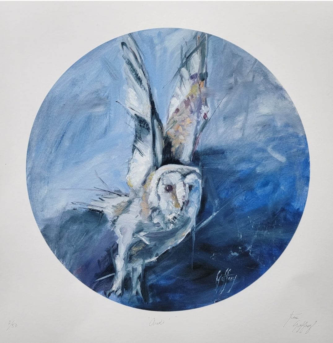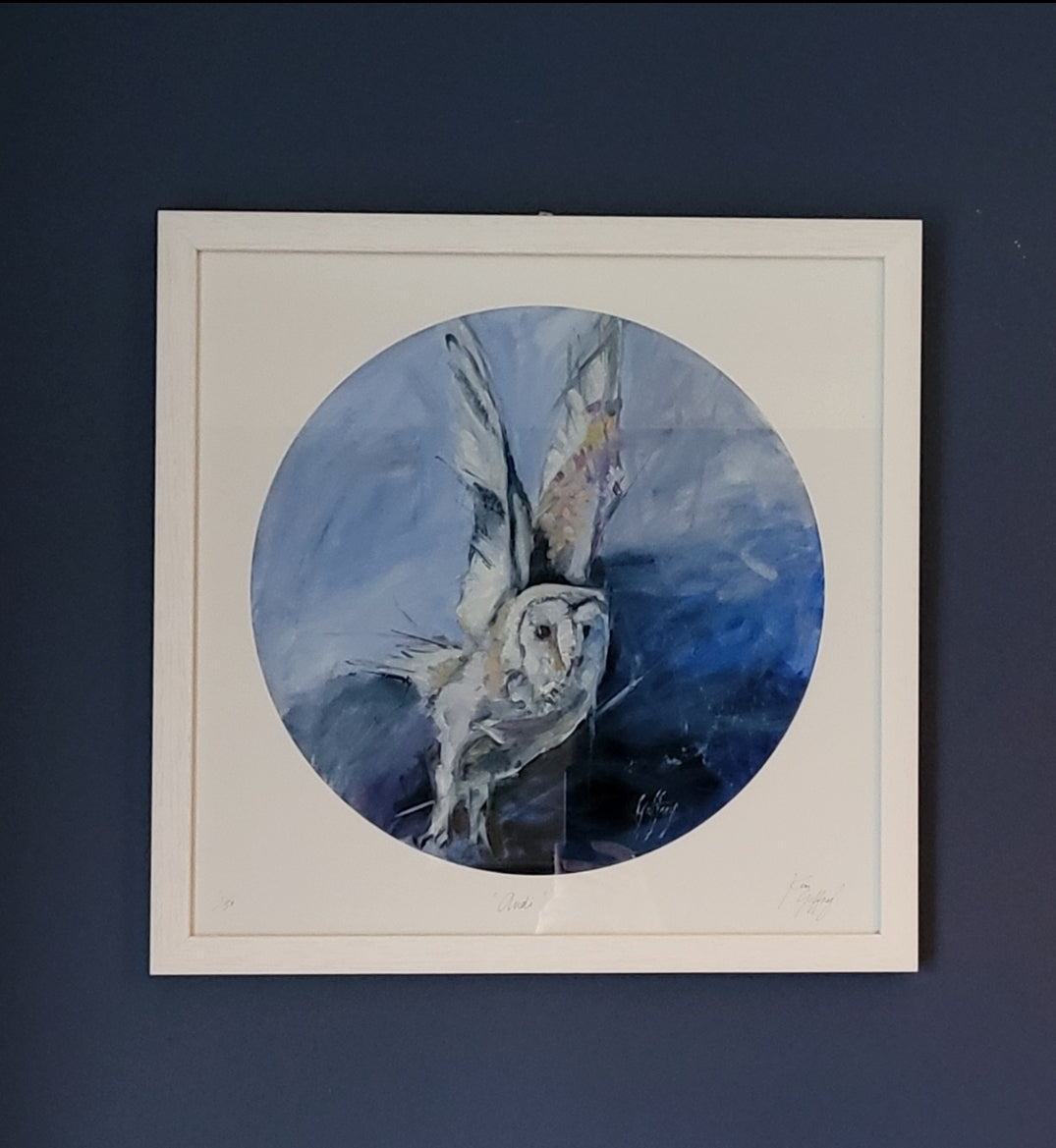 This print of the beautiful Irish white Barn Owl 'Audi' comes in a fine art Giclee print, scanned from the original Painting by The Copper House Gallery. It comes as a 12 inch print with the image size as 10" in diameter. There are just 25 of these prints at this size on my website. Free postage anywhere in Ireland. A perfect gift or for a children's bedroom.