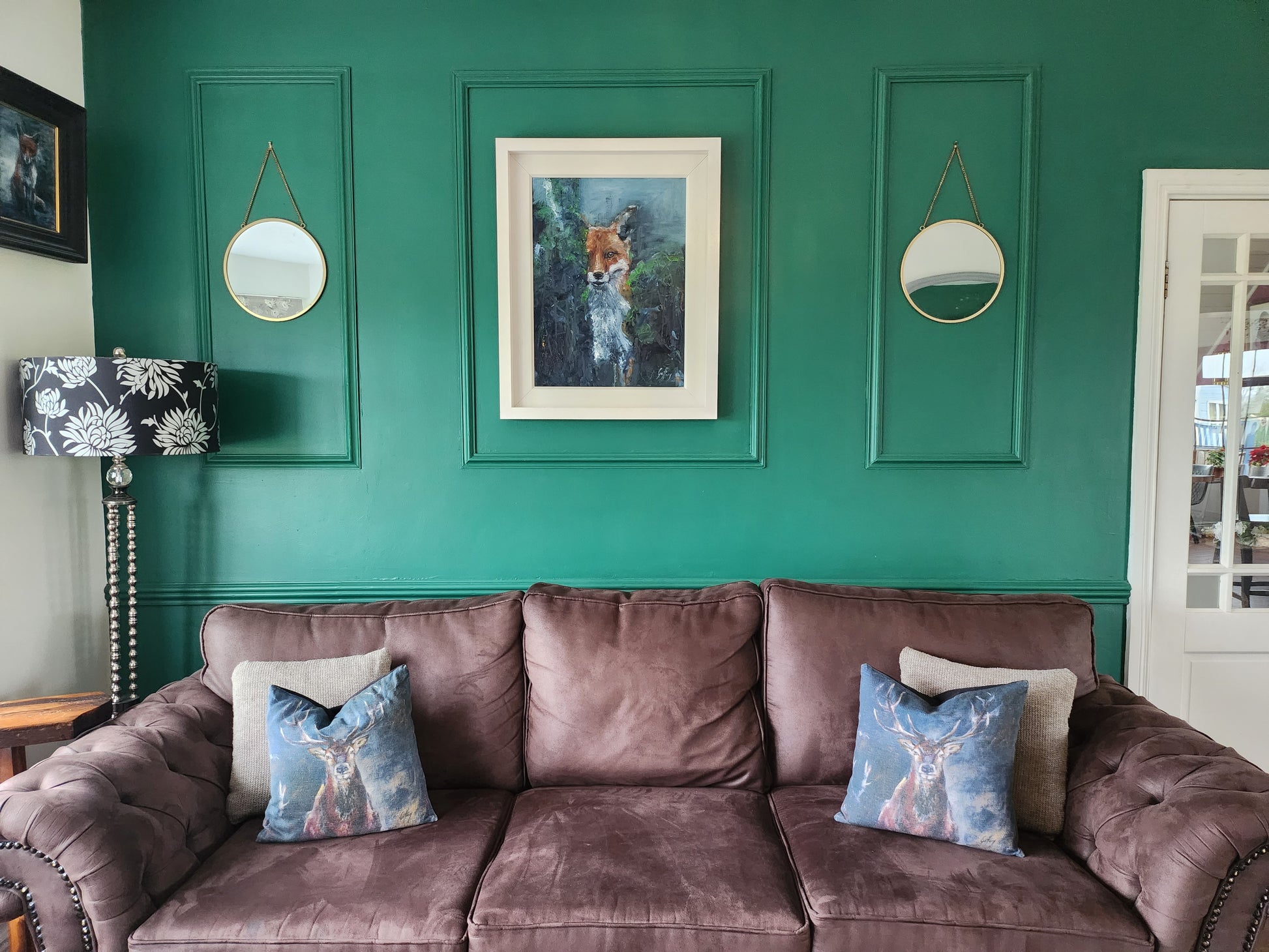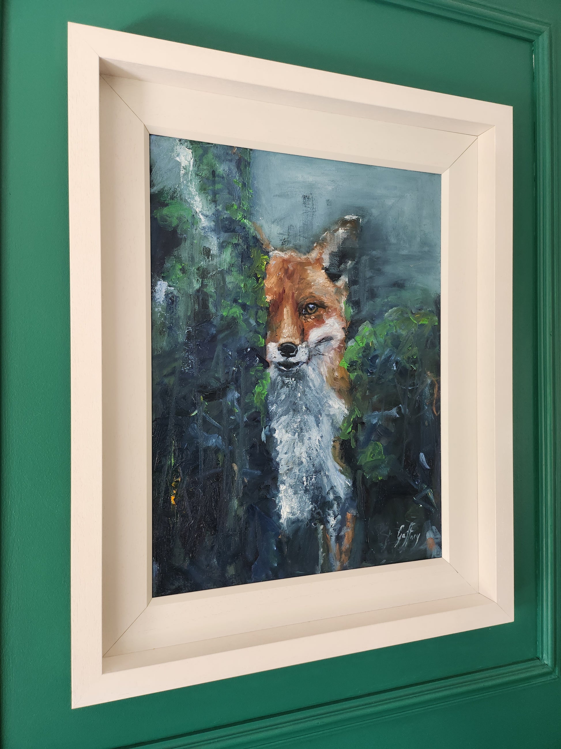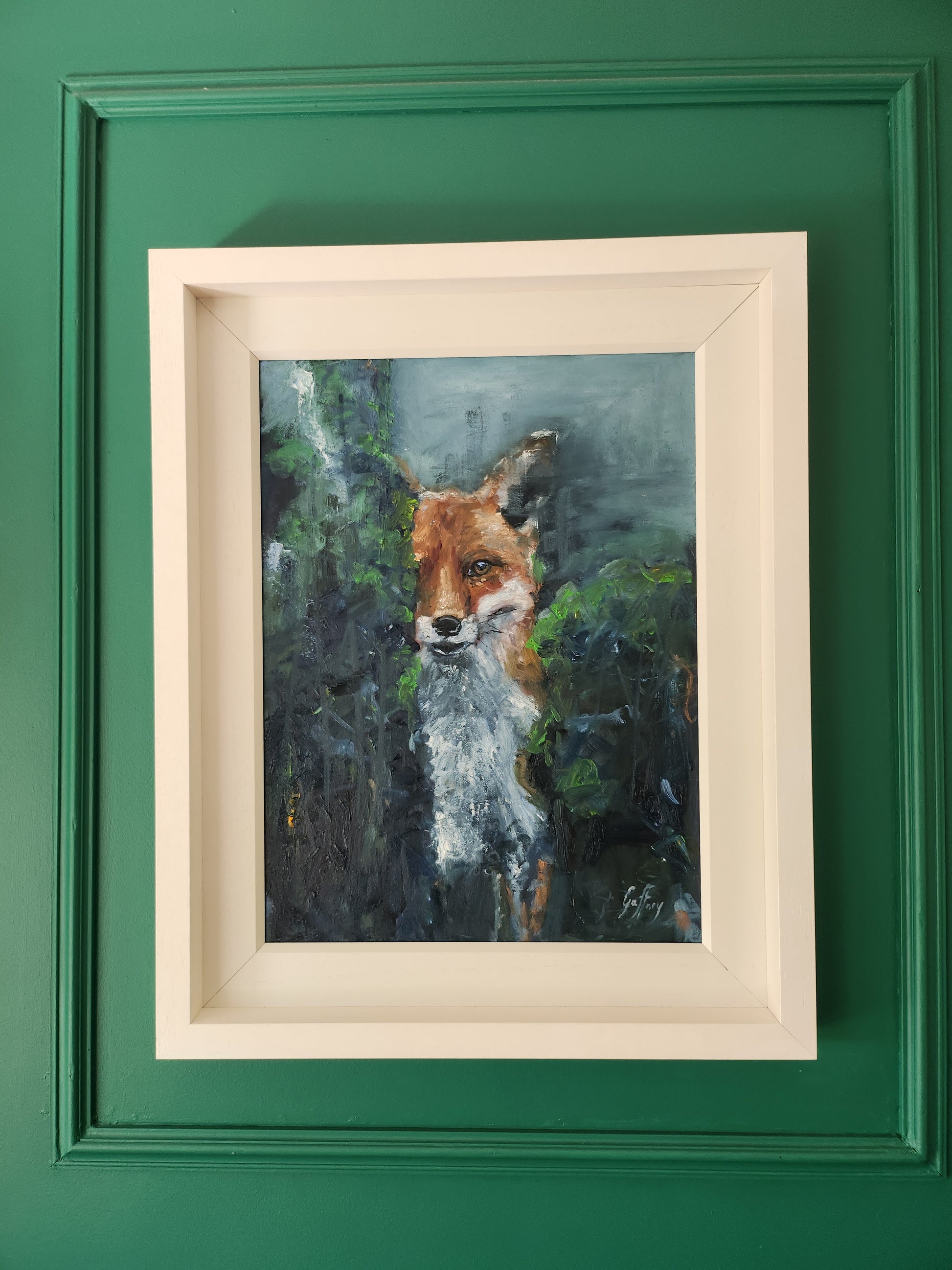 This vibrant fox was painted hidden behind some foliage. Though it's hard to tell if it's you looking at him or him looking at you.