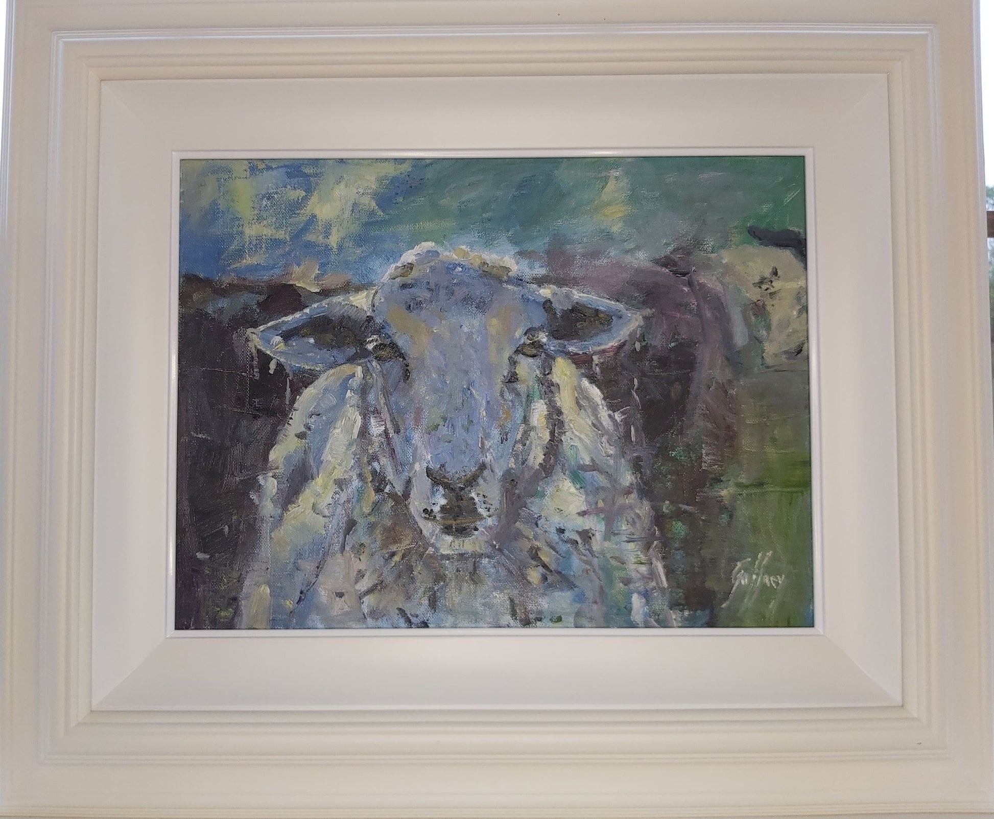 This sleepy sheep is looking a little lazy as most sheep do. This is a loose painting that is backlit, suiting the sheep’s sleepy stance. For me this reminds me of home as I grew up on a small sheep farm. This would be gorgeous in a country kitchen or as a present for the farmer in your life!