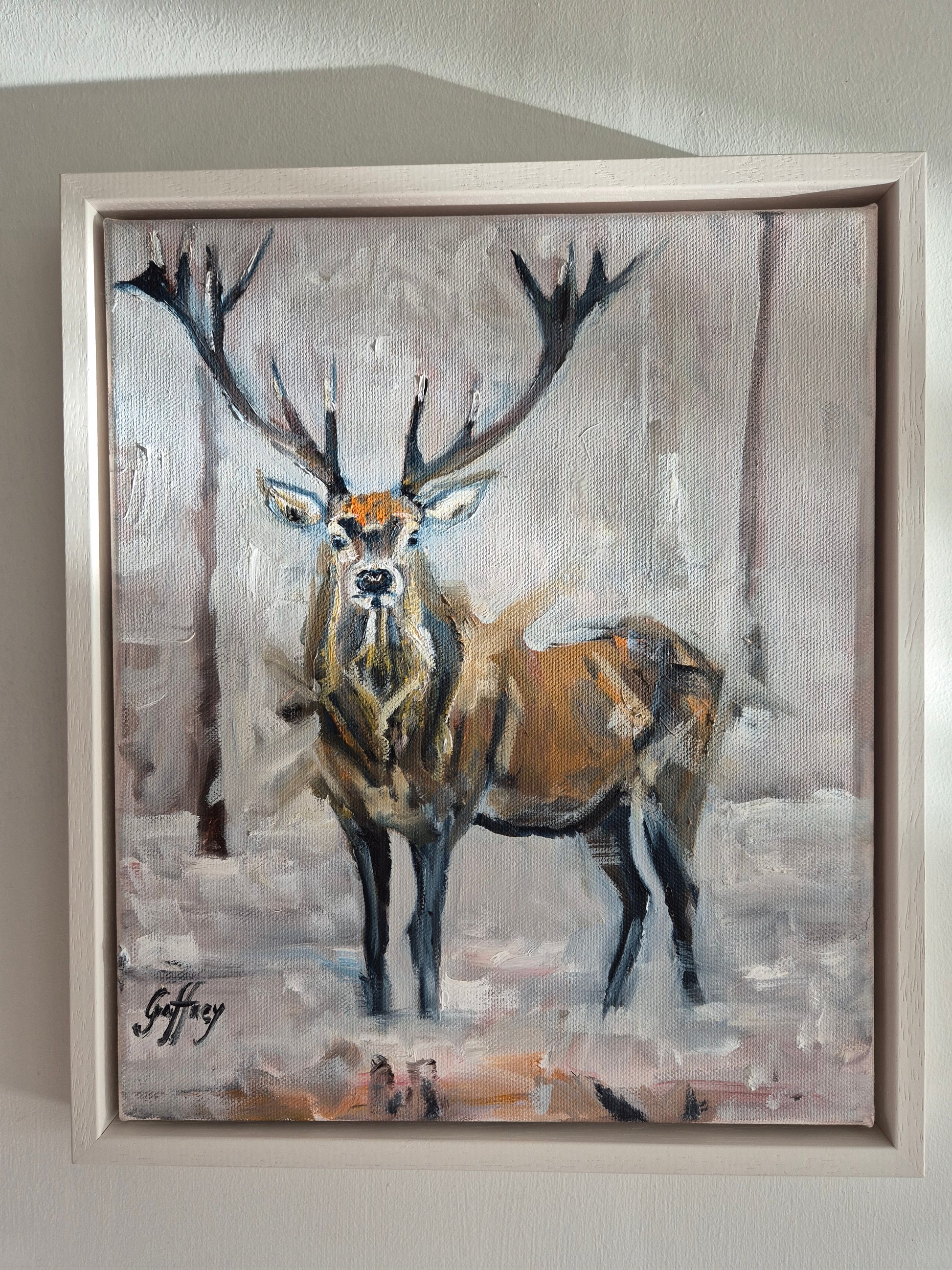 A playful painting portraying a startled Stag in a woodland winter scene.