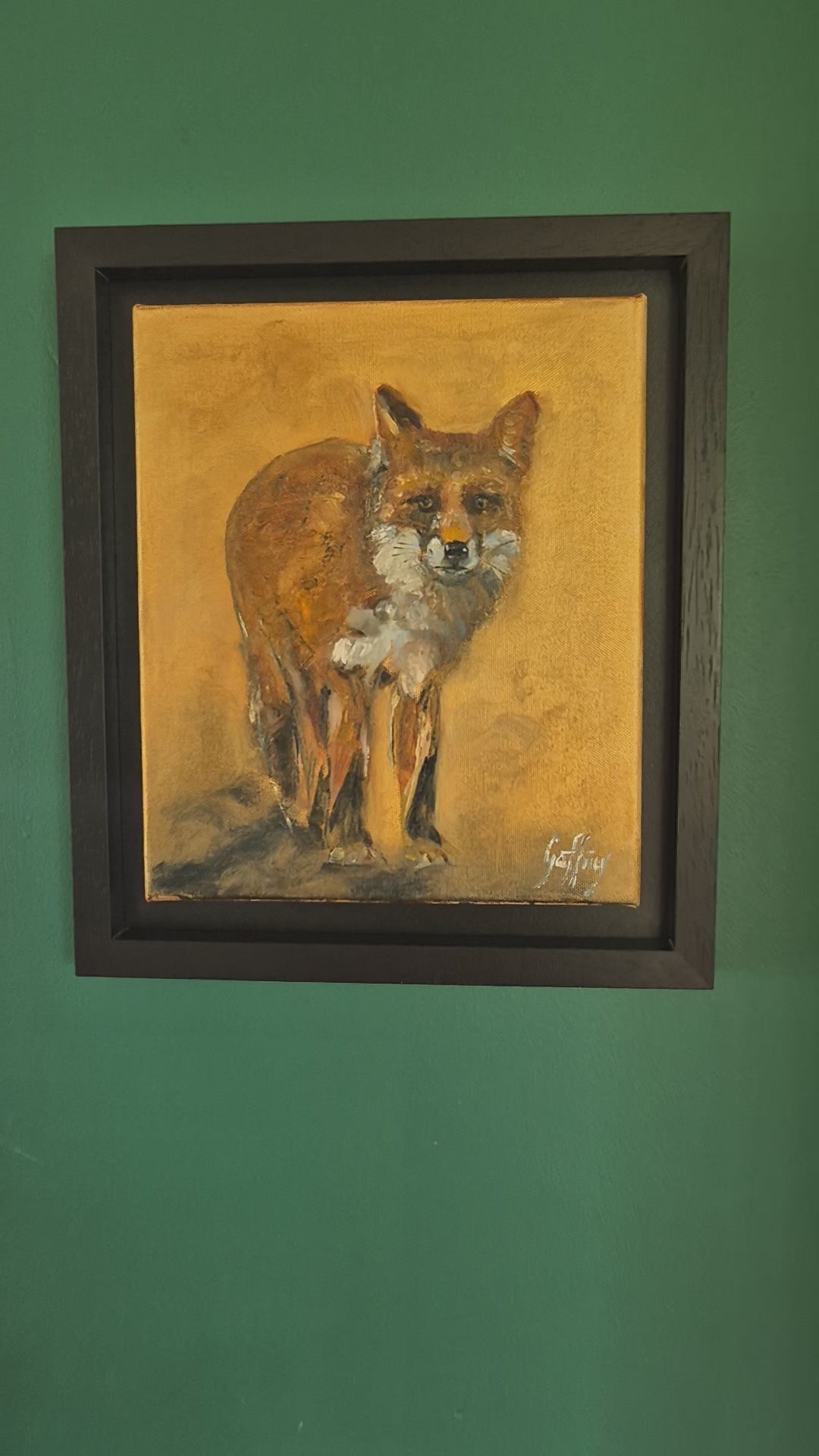 This oil painting features a cautious fox emerging from a luminous gold background. The fox is mid-step, its sleek body slightly in shadow, bathed in the warm glow of the golden surroundings. Its amber eyes are alert, ears perked forward, and its nose tilted slightly up as if sniffing the air for danger with a hint of orange to highlight it.