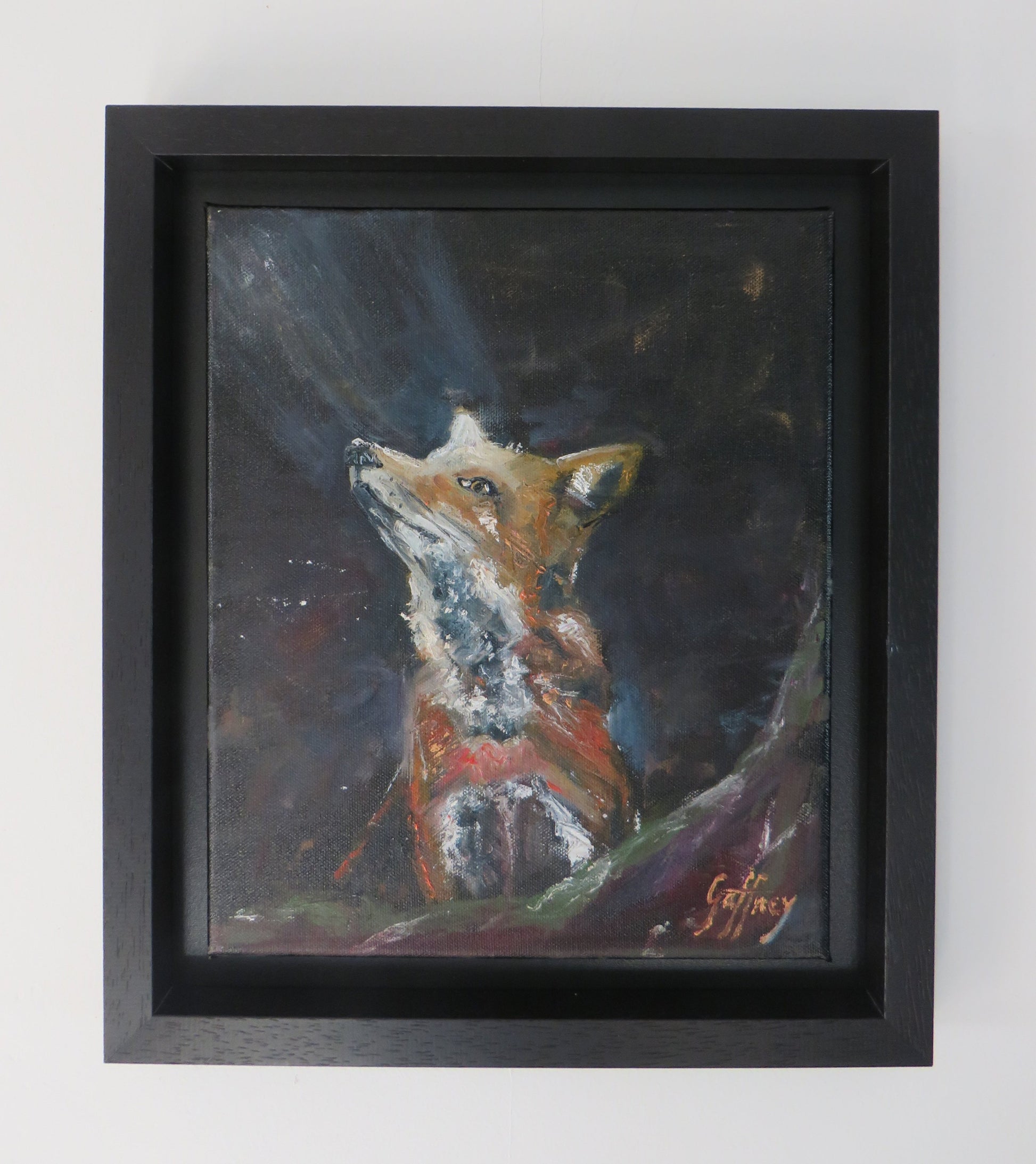 This curious fox is absolutely captivated by the moonlight. Painted as part of my 'Nightlife' collection, the golds, reds and browns of the fox contrast with the dark tones of the night time.