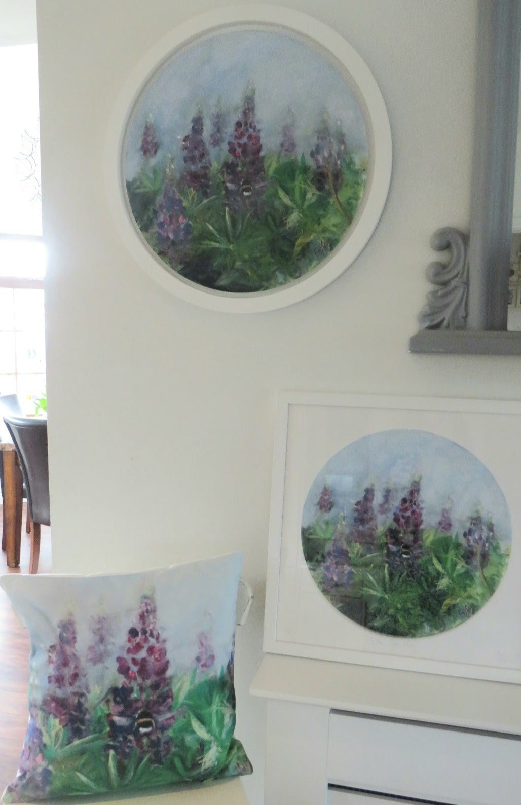 This 16" in diameter painting measures 19" in diameter including the custom made frame. This painting was inspired by my own garden which was full of Bee's last summer when I took the picture that inspired this painting.