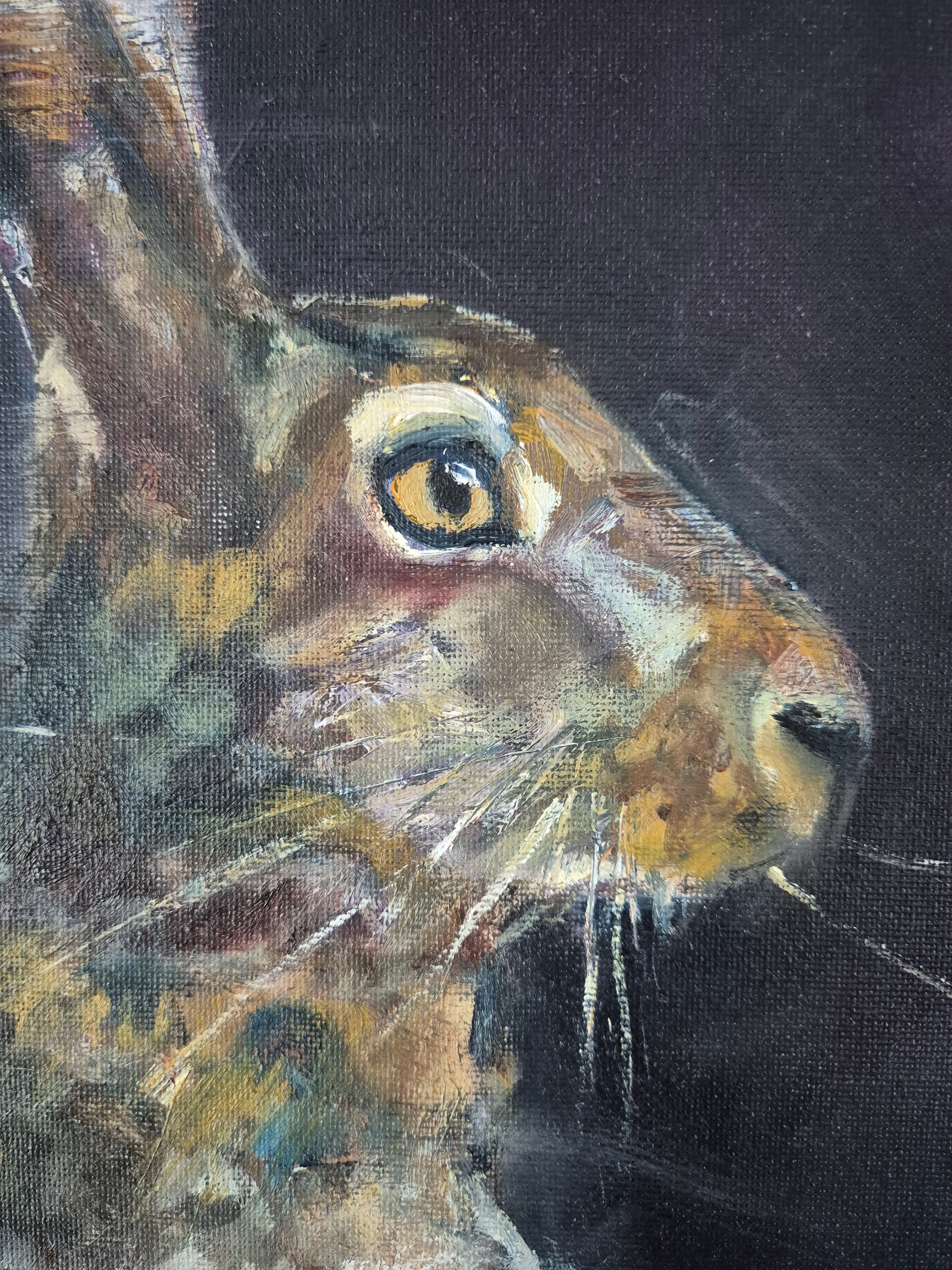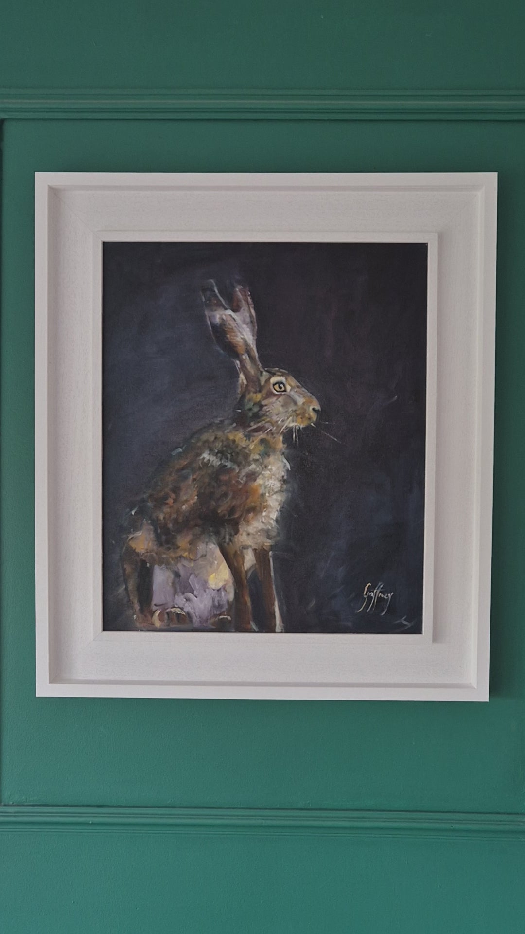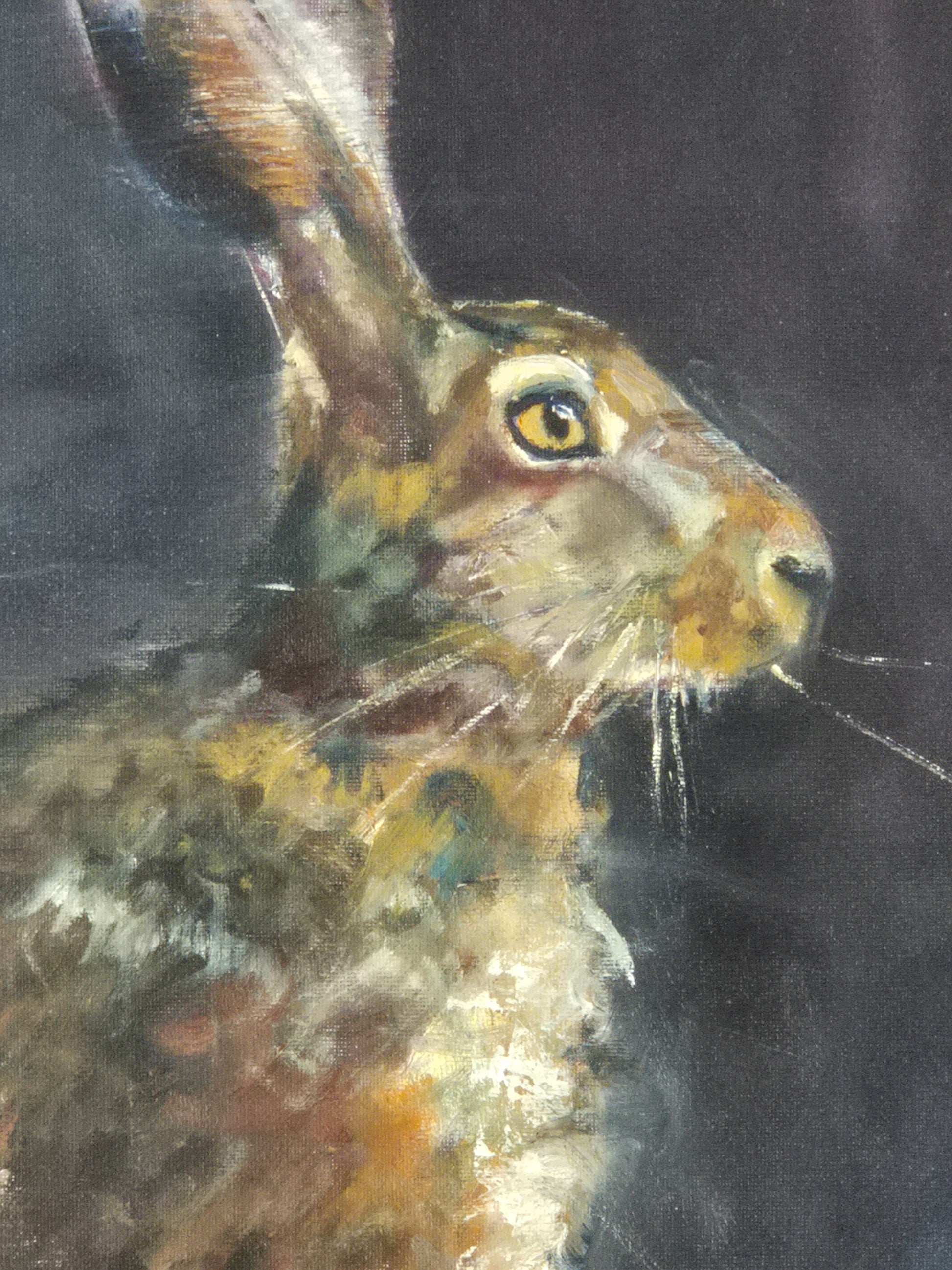 captures the quiet intensity of the natural world after dark. The hare stands poised against a deep, shadowed background — the darkness evoking the hush of the nocturnal Irish countryside. Illuminated by the cold silver of moonlight, the hare’s body is subtly front-lit, revealing fine textures in its fur and the tension in its limbs, as if caught mid-breath. The contrast between light and shadow draws the viewer into the stillness of the moment, evoking both vulnerability and alertness. The hare’s eyes glint faintly, reflecting the moon, as if aware of something unseen. A sense of myth and mystery lingers around this solitary figure — an animal caught between the physical world and the realm of legend.