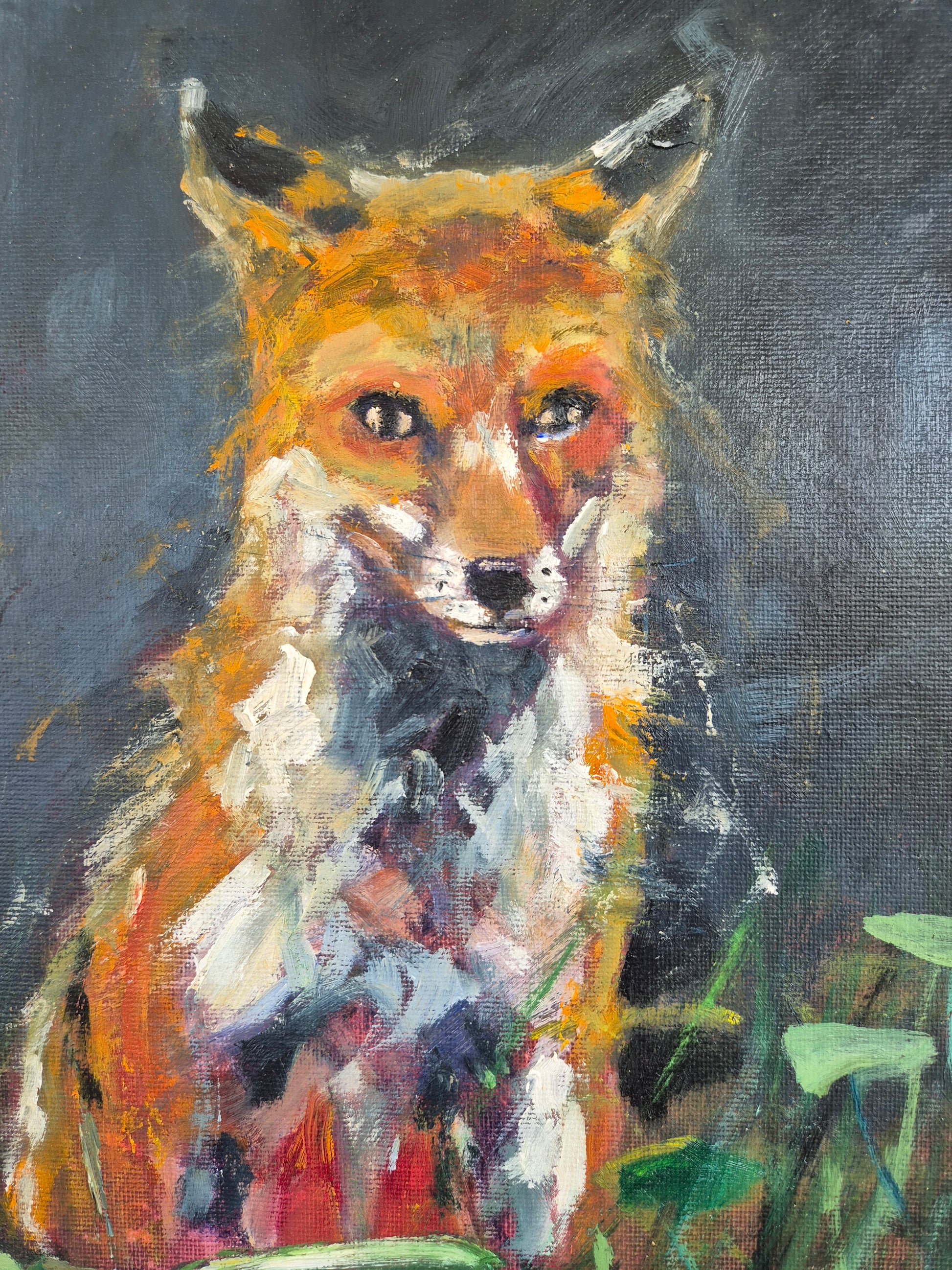 This new oil painting captures a quiet, spellbinding moment in the stillness of night. Emerging from the deep shadows of the canvas, a fox steps into a pool of faint light, its fur catching the glow with a soft, almost ethereal brilliance. The creature’s amber coat contrasts strikingly against the surrounding darkness, creating a sense of both mystery and revelation. Brushstrokes blend realism with atmosphere, inviting the viewer to pause—caught between movement and silence, wild instinct and quiet observation. The piece speaks to the hidden beauty of the natural world that thrives unseen under cover of night.
