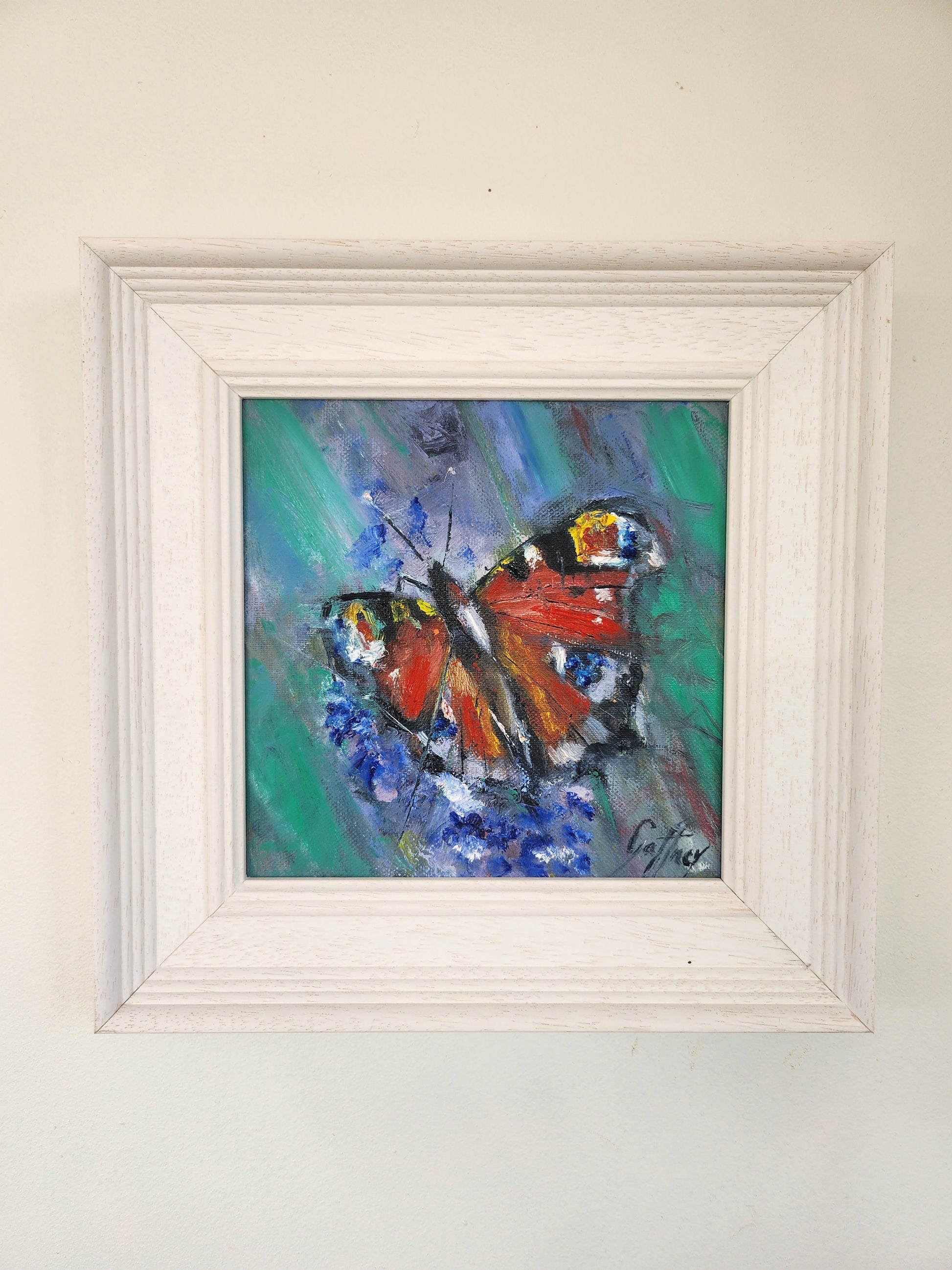 An original oil painting of the stunning 'peacock' butterfly, bursting with colour. This painting comes framed and ready to hang with free delivery in Ireland. It measures 29cm by 29cm, with a custom made frame.
