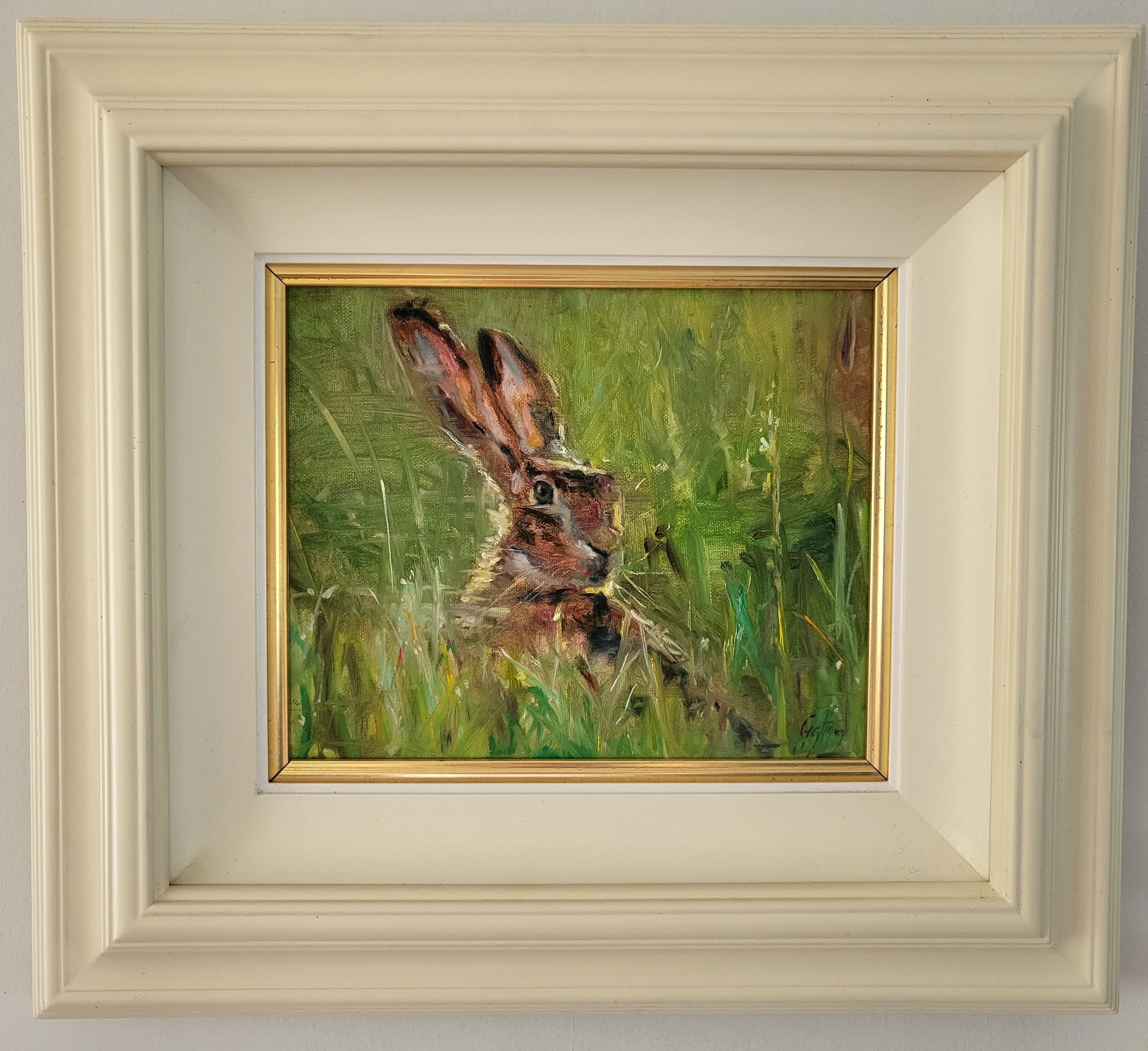 Depicting a watchful Hare looking over his shoulder, this painting was created from a photograph by the award winning wildlife photographer Andy Rousse. The painting measures 18" by 20 " including the frame. It is also available as a limited edition print.