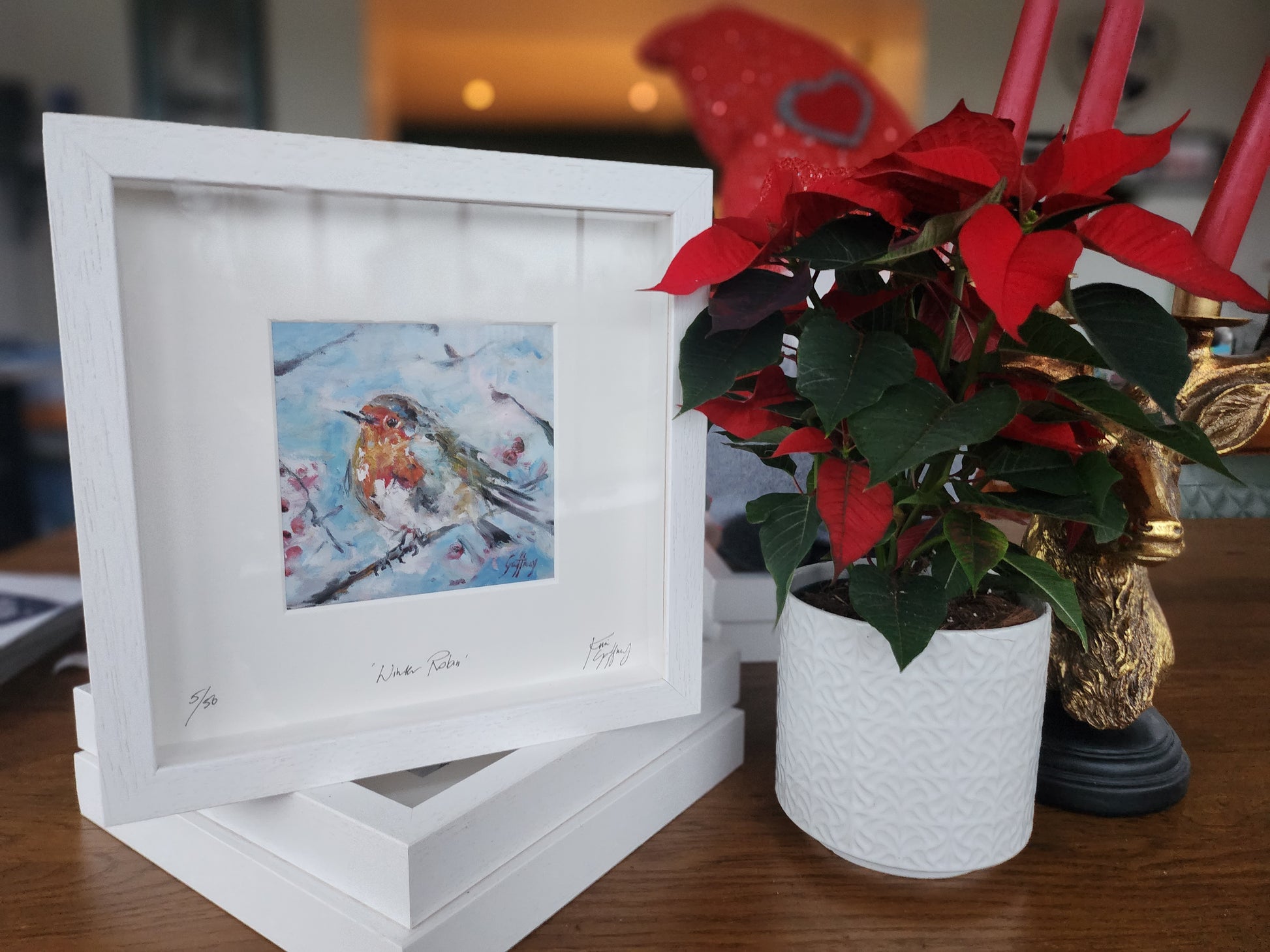 This 'Winter Robin' measures 10 inches framed and comes wrapped and ready to gift this season.